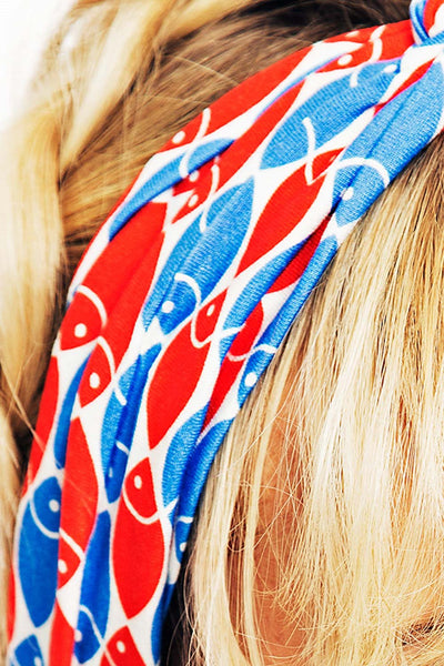 Tyget heter Mört Röd/ Blå. Ett livfullt mönster där blå och röda fiskar simmar i harmoniska formationer över en krispigt vit botten. Inspirerat av havets djup och sommarens fisketurer skapar mönstret en lekfull och tidlös känsla.