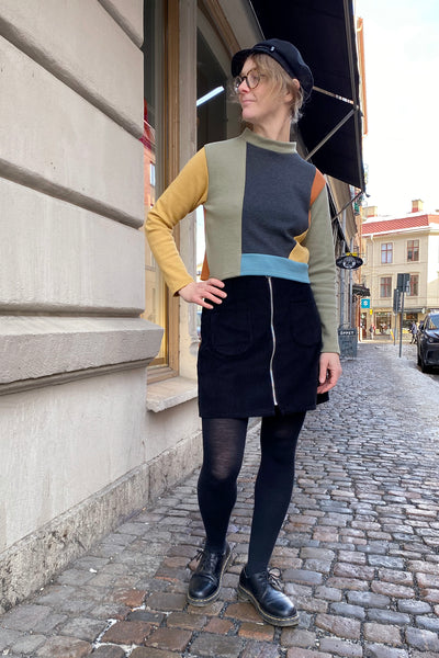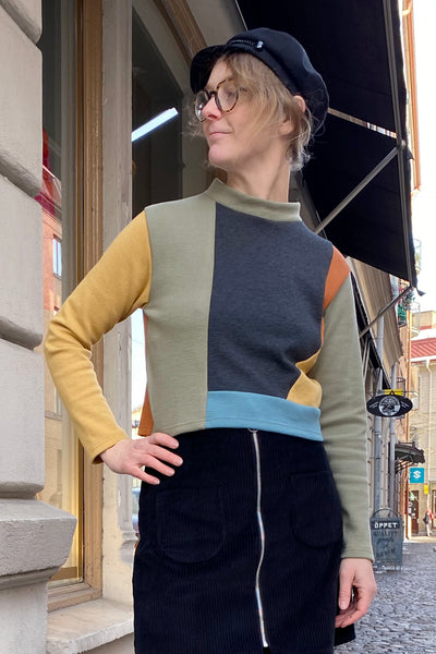 60's inspired unique knit patch top from our own brand. Straight cropped model with long sleeves. Made in Sweden of a new, Oekotex fabric of 95% organic cotton and 5% elastane.