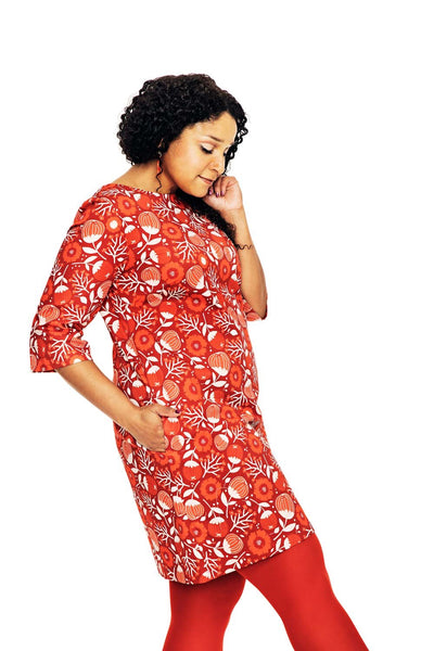 Klänning Olivia är en något kortare A-formad klänning inspirerad av 60-talet. Klänningen är nättare upptill och har lösare passform nertill. Den har en något vidare trekvartsärm, dolda fickor i sidorna samt dragkedja bak i ryggen. Klänningen är fodrad för att inte haka upp sig på dina strumpbyxor. Olivia är en perfekt modell att variera, bär den med strumpbyxor eller mer som en tunika till ett par byxor. Passar lika bra till vardags som till fest.