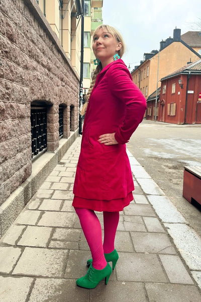Kappan Berit är inspirerad av 60-talet. Den har en a-linjeformad design med en skräddad look. Berit har flera fina detaljer som klädda knappar och rundad krage samt fickor fram och manchettknapp vid ärmslutet.
