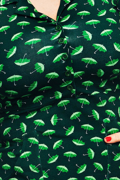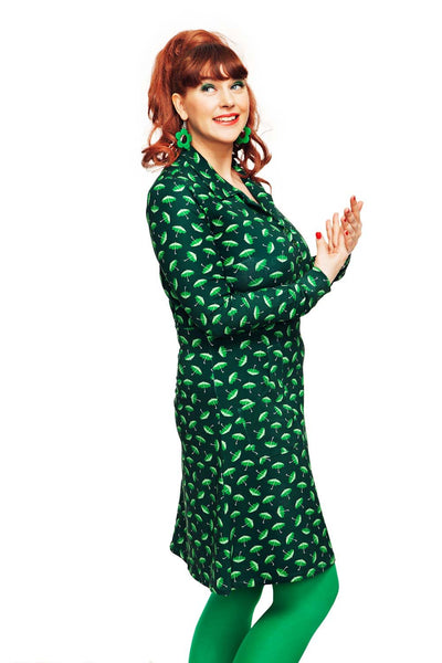 Tyget heter Paraply Grön och är ett paraplymönster med mörkgrön botten och ljusare gröna paraplyn på.