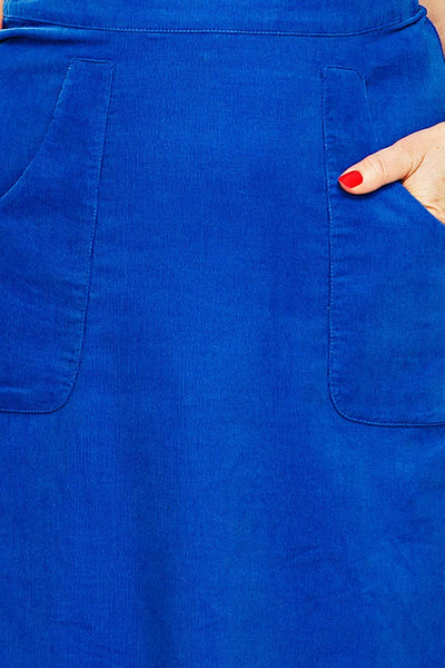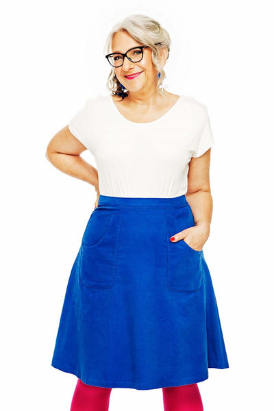Sonja är en utställd kjol från Cissi och Selma i vävt bomullstyg. Kjolen har linning upptill samt stora synliga fickor fram. Kjolen är fodrad så att den inte hänger upp sig på strumpbyxorna och är lätt att komma i och ur med dragkedja mitt bak.