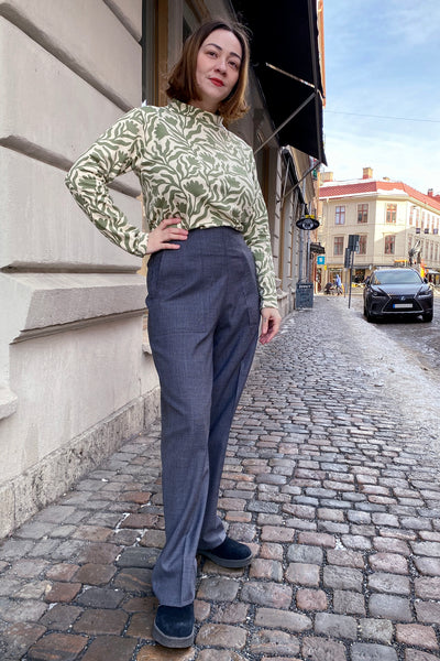 60-talsinspirerad trikåtopp från vårt eget märke. Skön rak modell med lång ärm och liten skorstenskrage. Sydd i butiken i Göteborg av ökotex-certifierad bomullssweatshirt i 95% bomull och 5% elastan. Naturfärgad bomull med ljusgrönt tryck.