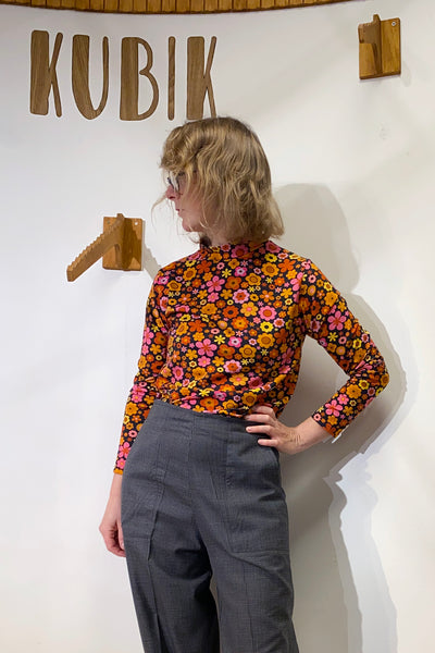 60-talsinspirerad trikåtopp från vårt eget märke. Skön rak modell med lång ärm och liten skorstenskrage. Sydd i butiken i Göteborg av ekologisk GOTS-certifierad bomullsjersey i 95% bomull och 5% elastan.
