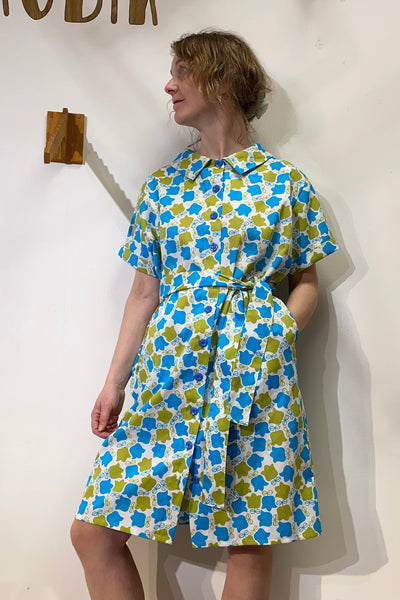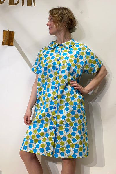 Vår egen blusklänning i ett otroligt deadstock vintagetyg, gissningsvis från 60/70-talet. Blommigt i ljusgrönt och turkost på vit botten.