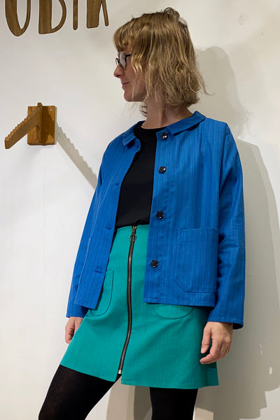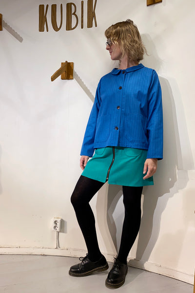 Vår egen overshirt sydd i Strömmas klassiska 60/70-talstyg Lotta i blå färgställning. Tyget är oanvänt från tiden och i en fantastisk kvalitet. Ett arv från tiden då Sverige var ett textilland och Norrköping hade ett stort bomullsväveri.