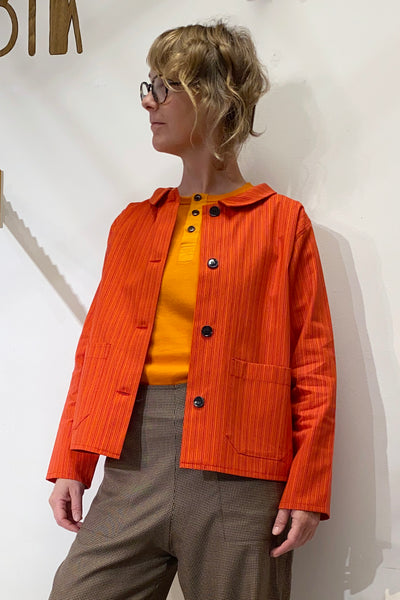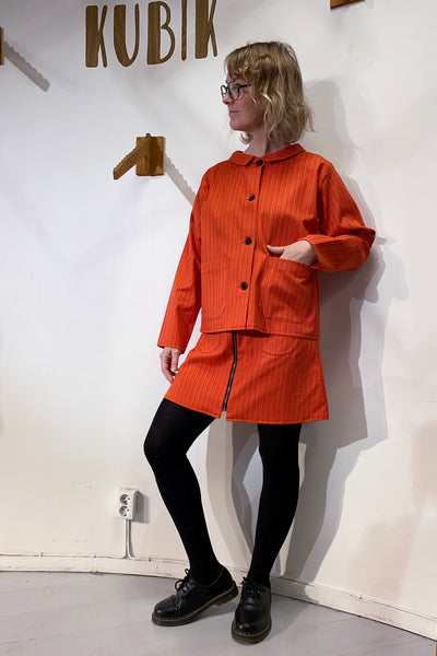 Vår egen overshirt sydd i Strömmas klassiska 60/70-talstyg Lotta i rödorange färgställning. Tyget är oanvänt från tiden och i en fantastisk kvalitet. Ett arv från tiden då Sverige var ett textilland och Norrköping hade ett stort bomullsväveri.
