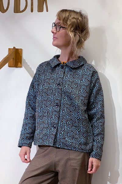 Vår egen overshirt sydd i ett härligt lite tjockare vintagetyg. Tyget är oanvänt från tiden med ett härligt mönster i ljus petrol och brunt. Insidan är lite luddig vilket gör denna otroligt mysig. Finns endast i två exemplar