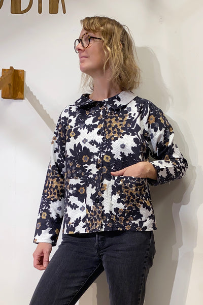 Vår egen overshirt sydd i ett härligt lite tjockare vintagetyg. Tyget är oanvänt från tiden med ett härligt mönster i vitt, svart och brunt. Tyget har lite struktur vilket ger en lyxig känsla. Finns endast i två exemplar